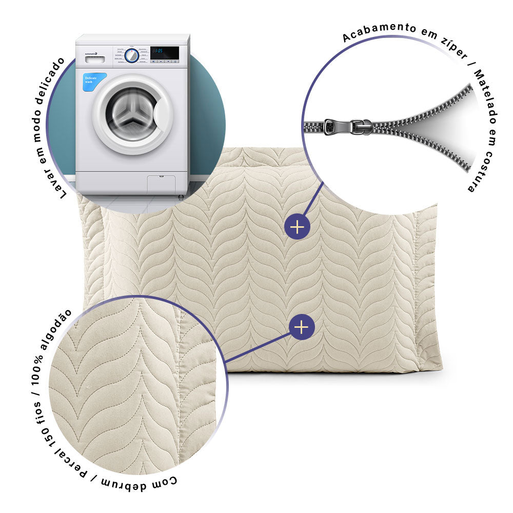 A meticulosa técnica de matelado em linha cria desenhos encantadores, adicionando um toque refinado à sua cama. O debrum habilmente confeccionado confere destaque adicional à peça, elevando o estilo do seu ambiente.